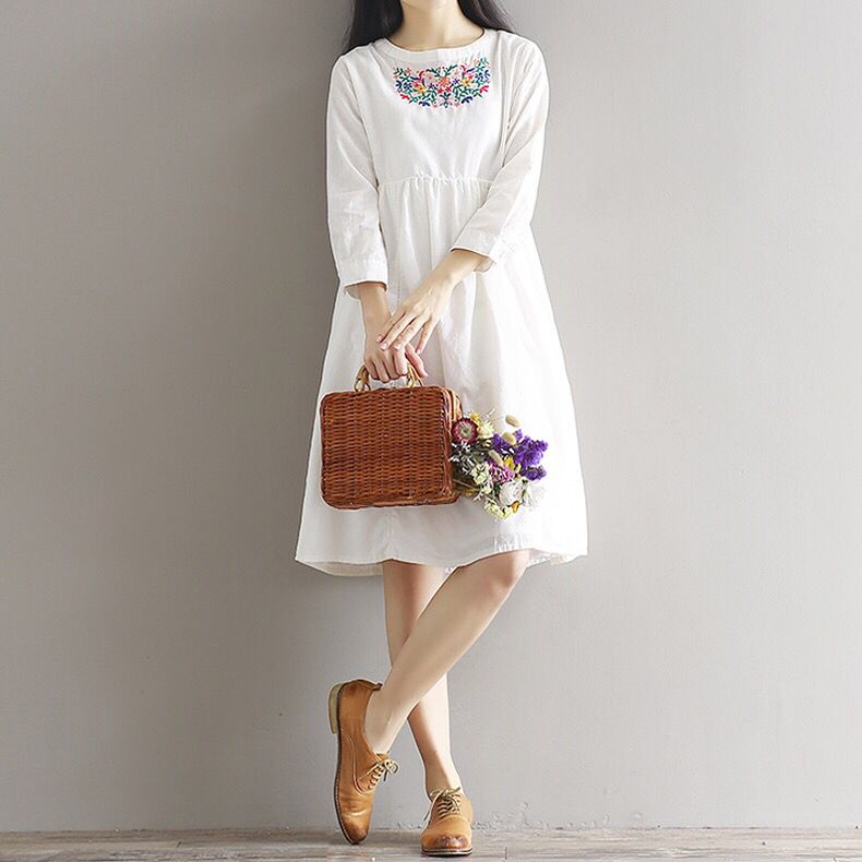 【推荐】经典的圆领设计,巧妙的将女性的颈部线条得以完美的展现。有点民族风的小刺绣,小巧而精美,展现出气质女性的魅力。恰到好处的长度正好可以适合任意身高的女生哦。