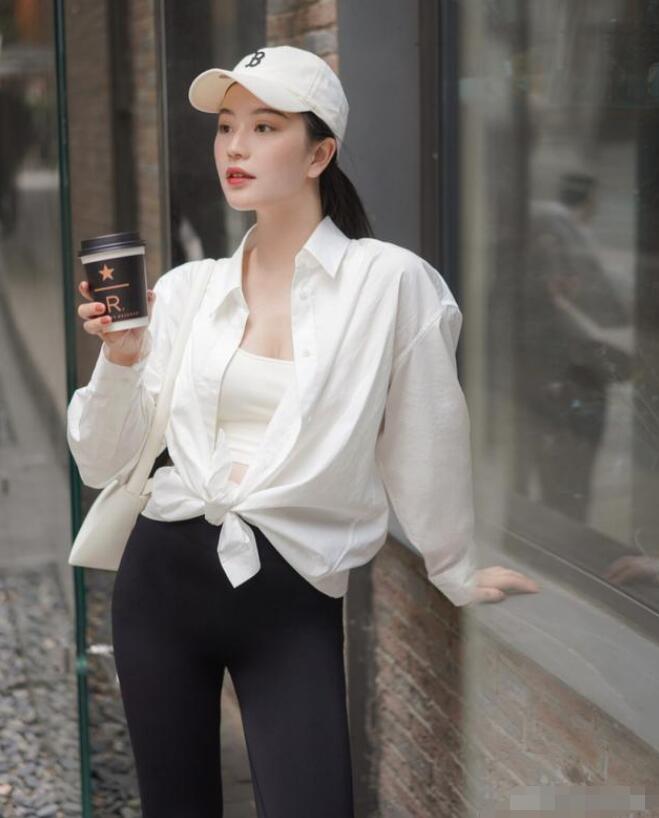 今天小编跟大家分享这组极简的搭配,白衬衫内搭露脐吊带衫,下装紧身运动裤,脚踩运动鞋。适合平时晨跑,体育馆,假日休闲等场景的搭配造型,休闲运动风搭配到带点迷人的女人味,让人赏心悦目。