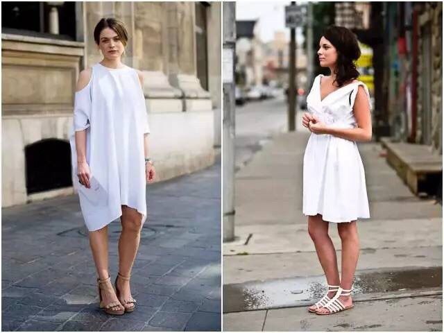 白色连衣裙穿不好就会给人很肉的感觉,即便是身材很瘦的欧美妹子,也未必驾驭的好这种宽松款式,相比之下,右图有收腰和v领的修饰作用,整体裙装造型会更加利落简洁。
