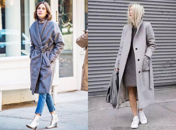 高级灰大衣与小白鞋也十分和谐不会太过明艳,内搭灰色毛衣简约大方,知性而优雅。穿衣技巧!如果特别怕冷的MM可以选择浴袍式的,搭配牛仔裤,看起来再也不那么慵懒。
