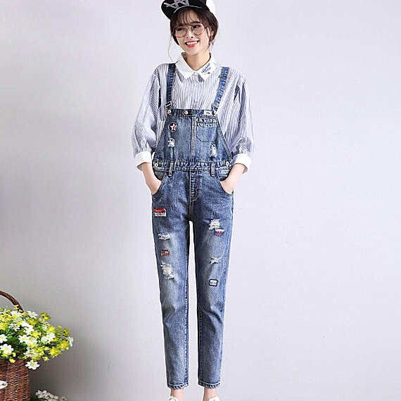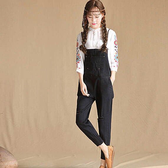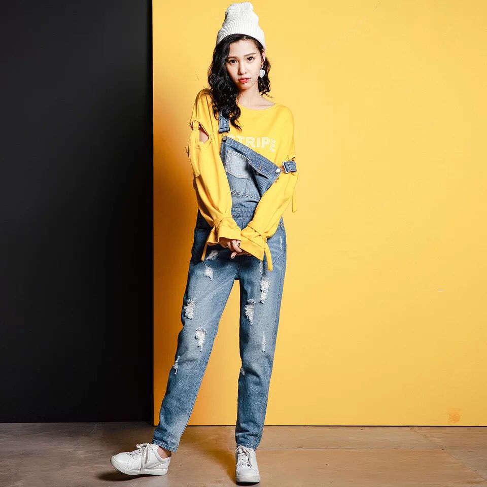 泛着历久弥新天然磨白的牛仔裤,配合着充满俏皮感的搭扣背带设计,释放出无限活力让青春飞扬;而精致的时尚贴布微整体造型冠冕添彩,配合着随性不羁的磨毛破洞修饰,顷刻打造出知性大方的轻文艺学院风格。