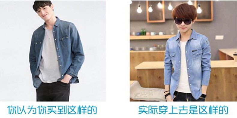 关于“印花”色的牛仔衬衫,网上的印花色大多都是有色差的,大多都会出现让人不满意的效果,所以在选购的时候多注意。