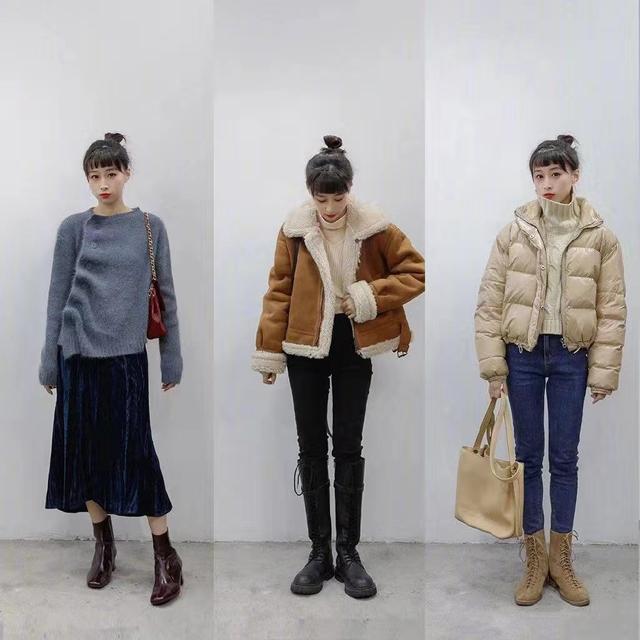 大多数的小个子比较喜欢短款的服装,这款短款的毛衣虽为纯色,但是设计十分独特,采用褶皱的方式,让服装更加有造型感。下装搭配显瘦的黑色半裙。另外两款就都是采用短款的外套搭配上修身的牛仔裤了,一款是羊羔毛与鹿茸皮的结合,非常具有保暖性。另一款的羽绒服则更是保暖一些,但是款式更加简约大方。