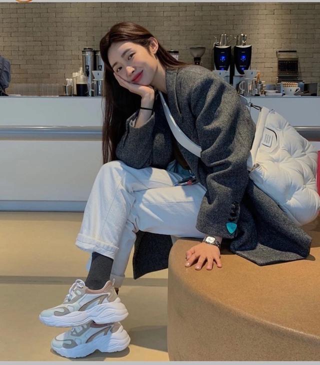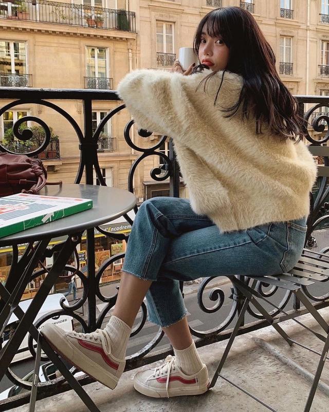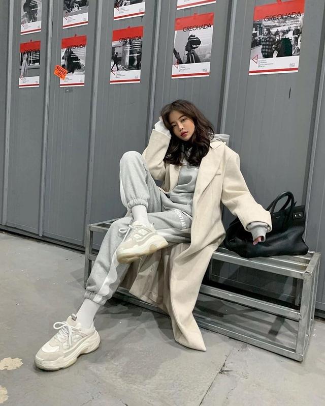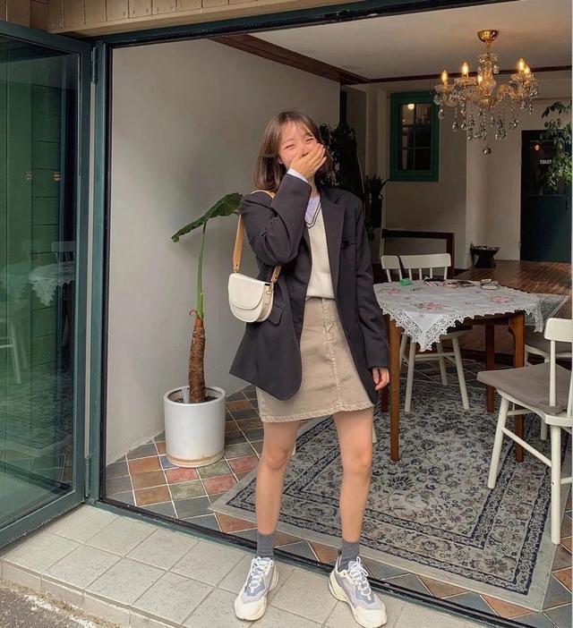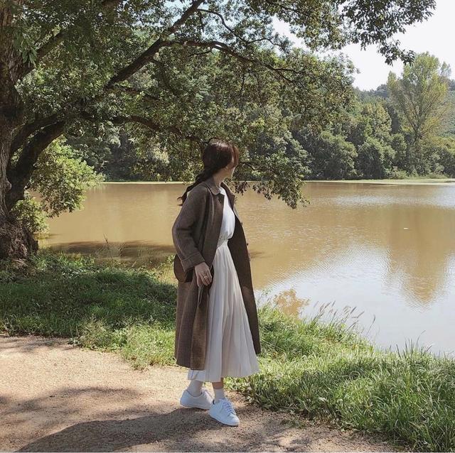 白色的运动鞋搭配裙子,让你看上去更有活力。再加之,白色本就是一个人纯洁的象征,还会增加你的气质,穿上一双白色的袜子,还能修饰你的腿型。棕色系的大衣,天气冷的时候也可以这样搭配。