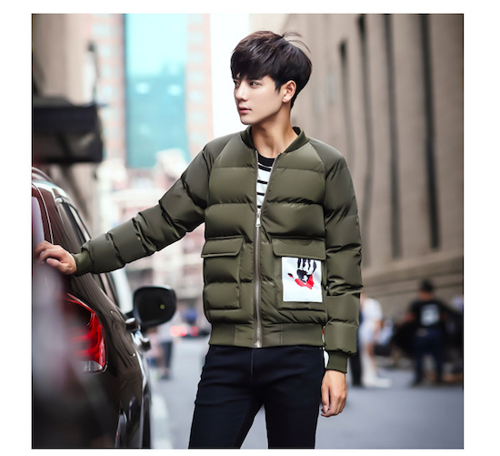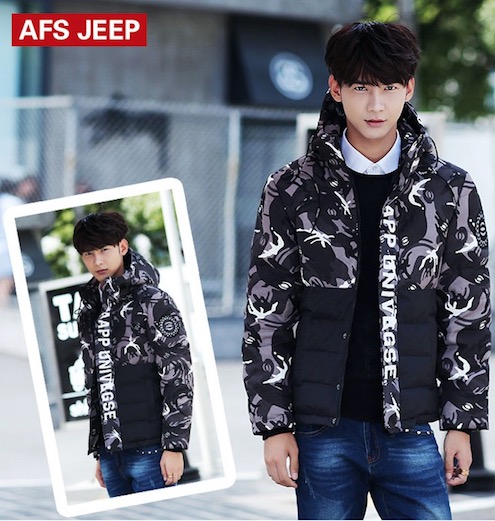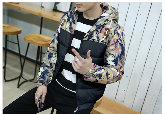 1.短款迷彩羽绒服,简单的领口设计时尚大方又不失风度,精细的做工尽显衣服的品质。下摆贴合身形,上身效果非常棒,内搭衬衫和圆领毛衣,彰显男人高端品位,独特的款型尽显潮男风范!