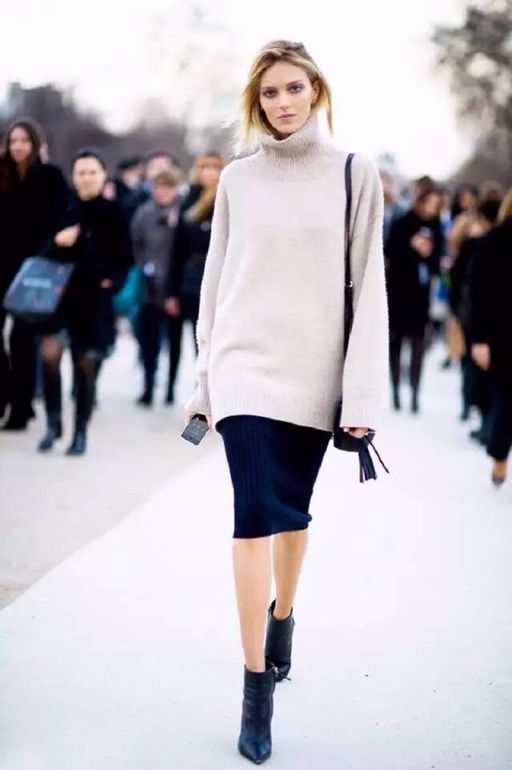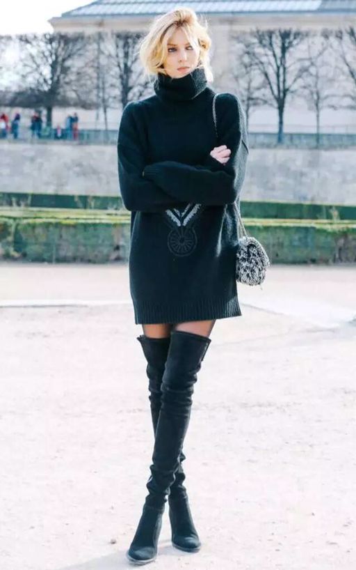 除了前面已经推荐过的毛衣+铅笔裙的搭配,用宽松的毛衣裙来搭配过膝靴,也能诠释出最极致的女人味。