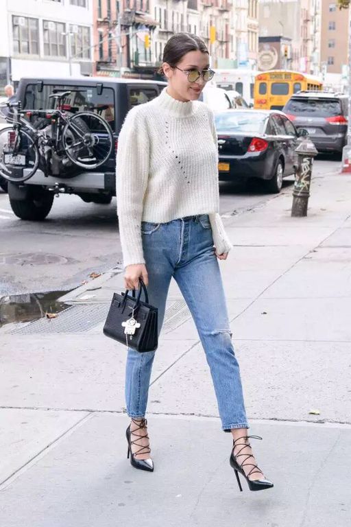 毛衣搭配永远的潮流单品——牛仔裤,最能演绎出复古率性的街头风范。而根据“适度露肤”的黄金穿搭准则,露出脚踝的九分裤在视觉上显高效果最好,能够让你穿出好的比例身材。如果你身处尚未大幅度降温的南方地区,不妨抓住今年最后的时机,搭配一双在今年风靡时尚圈的绑带高跟鞋,干练的裤装也能穿出满分女人味。