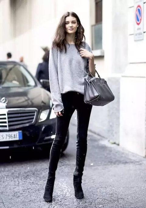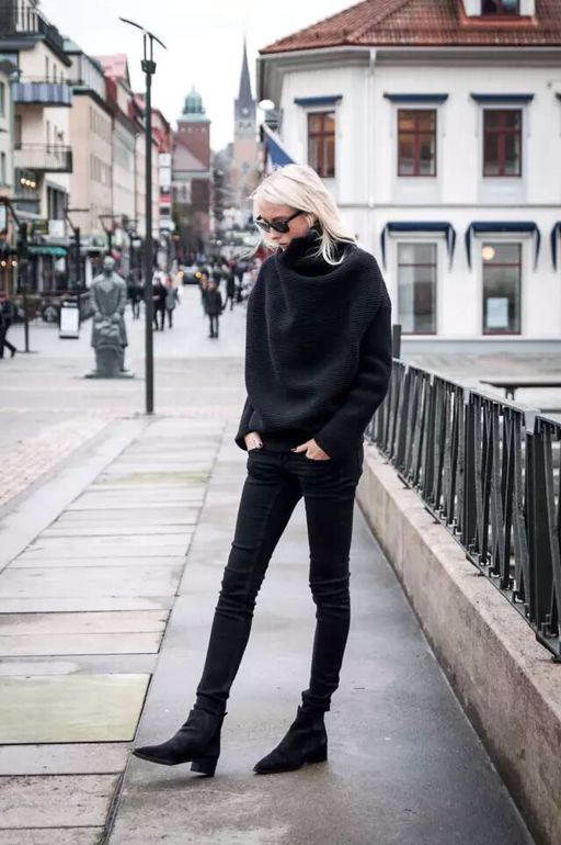 喜欢简约风格的女生,直接用最经典大气的黑白灰三色与小脚裤搭配即可,便足够又chic又帅气。近年来最受推崇的廓形高领毛衣,更能穿出时髦型范。