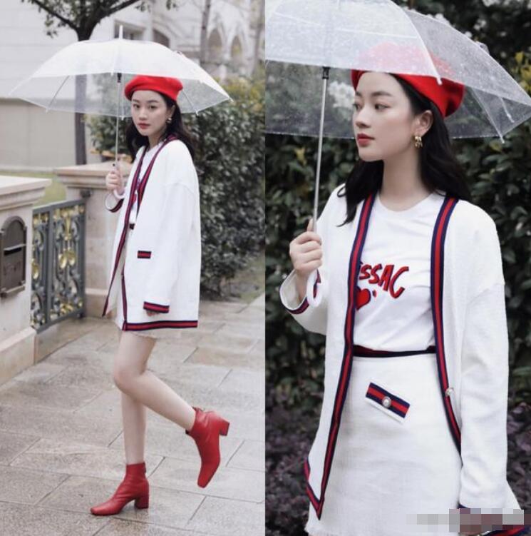 优雅的春季,即使没有chanel,也可以搭配出小香风,尤其是小香风的套裙。像这种大面积简单色块的针织衫,带有红色的撞色边,撞色袋唇设计,锦上添花的就是大红色的贝雷帽和高跟鞋,优雅俏丽,自成一派的复古调调。