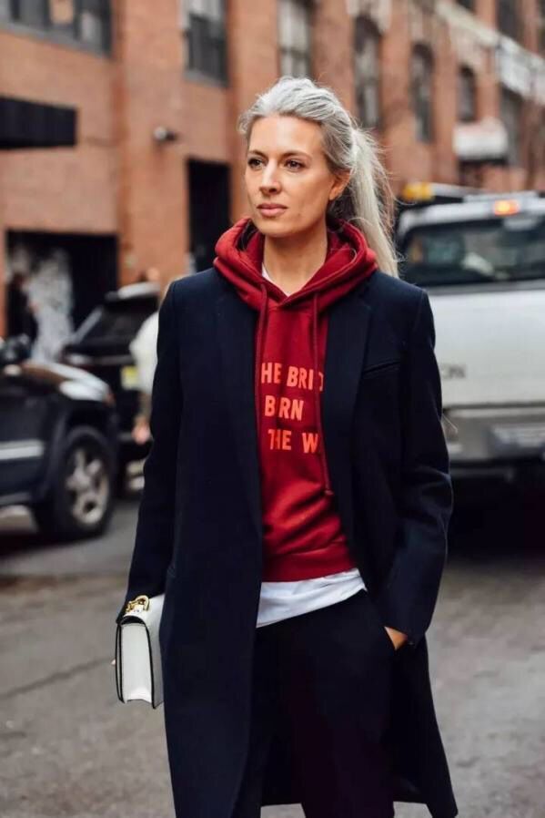 冬季选择内搭的时候,不一定都是要穿毛衣,试试卫衣也是可以的,而红色连帽卫衣的出现,外穿黑色长款大衣,就充分的证明黑配红也是很好看的,吸睛度也是upupup~