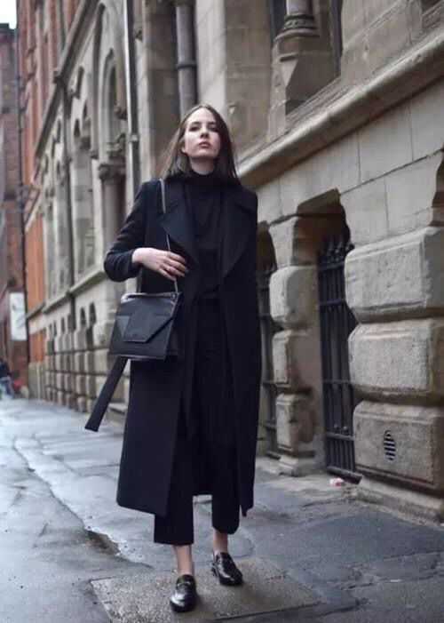 如果小仙女想要显;高显瘦,那么请快点get这身搭配,因为小编已经忍不住为它疯狂打call。黑色长款大衣,与黑色阔腿裤,还有黑色乐福鞋,没错,搭配屋。就是这么与众不同的帅气!