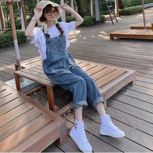 这身搭配清新大方,蓝色系的背带牛仔裤搭配白色T恤,整体干净简洁的风格超级养眼,裤子的宽松休闲设计可以很自然的将腿部的肉肉悄悄的掩盖,而且背带裤的长款设计可以在视觉上拉长腿型,呈现出大长腿的效果。小白鞋与上衣的融合完美至极。