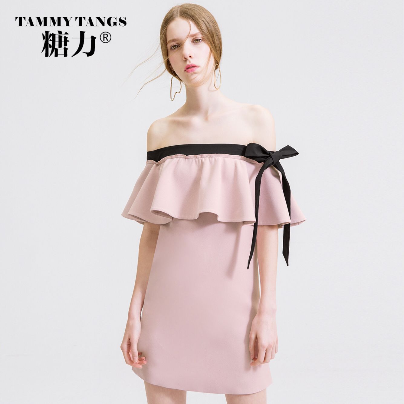 裸粉色的一字肩连衣裙,周边缝制了一圈同色荷叶边,黑圈包边,露出的长缎可在肩侧系一个蝴蝶结,裸粉温柔知性,衣服的整体剪裁设计温柔大方,整个人都笼罩着一层温暖的光,非常适合小仙女们穿出去见心上人哦~