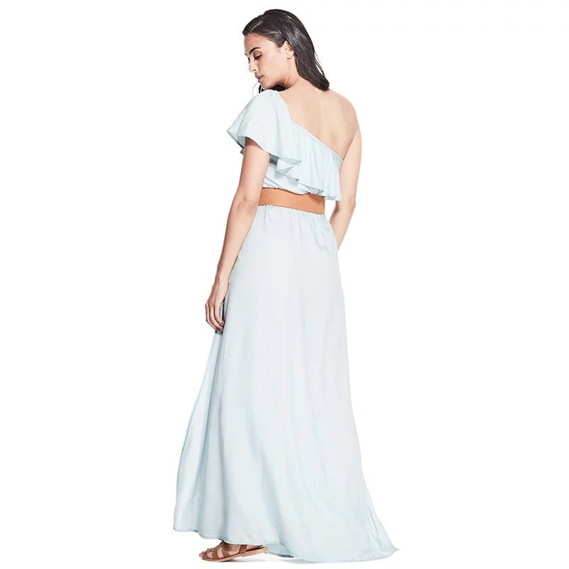 斜露肩的百褶束腰裙,浅浅的蓝色在夏天看非常清新,侧边高开叉的设计在走动的时候能若影若现的露出长腿,穿一双绑带罗马凉鞋,有一种古希腊女神的气质。