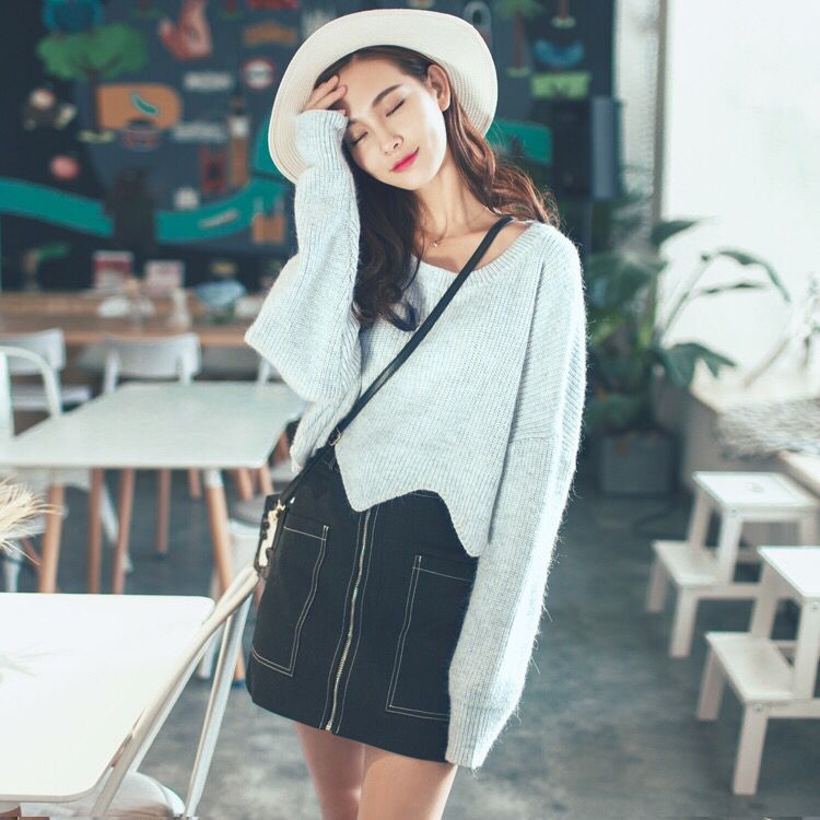 套头毛衣是最最好穿的,混合颜色,下摆是波浪形状,蝙蝠大袖子宽松廓形完全可以遮住肉肉,面料就是那种摸起来软绵绵的,穿上去一点也不扎,很亲肤,超级柔软。裙子中间开拉链,前片有两个大大的口袋,撞色线的设计立马让这条裙多了小细节哦。