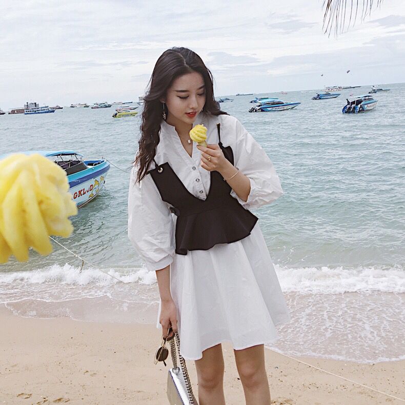 话说吊带外穿这样的时尚穿法,一直很受潮人们的喜欢,长款短款都有不同的特点,风格百变,这款是V吊带两件套的连衣裙哦,上身效果炒鸡赞哦,我也挺喜欢这款的,因为可以穿出两种风格哦,一套裙子风格随意切换,超喜欢的。