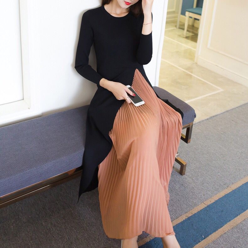 个性的撞色两件套连衣裙,展现了优雅女性之美,外在针织开叉裙、内有细腻的褶皱裙,经典之作,女装搭配,两种不同元素的融合,却能在视觉上很融洽的揉合在一起,形成一种别致的魅力,具有强力的时尚设计感,优雅灵动,经典圆领设计,突出简约自然之感,增添了别样风采,轻盈唯美的袖口设计,简约而不简单,舒适贴合手臂曲线,尽显优雅魅力。