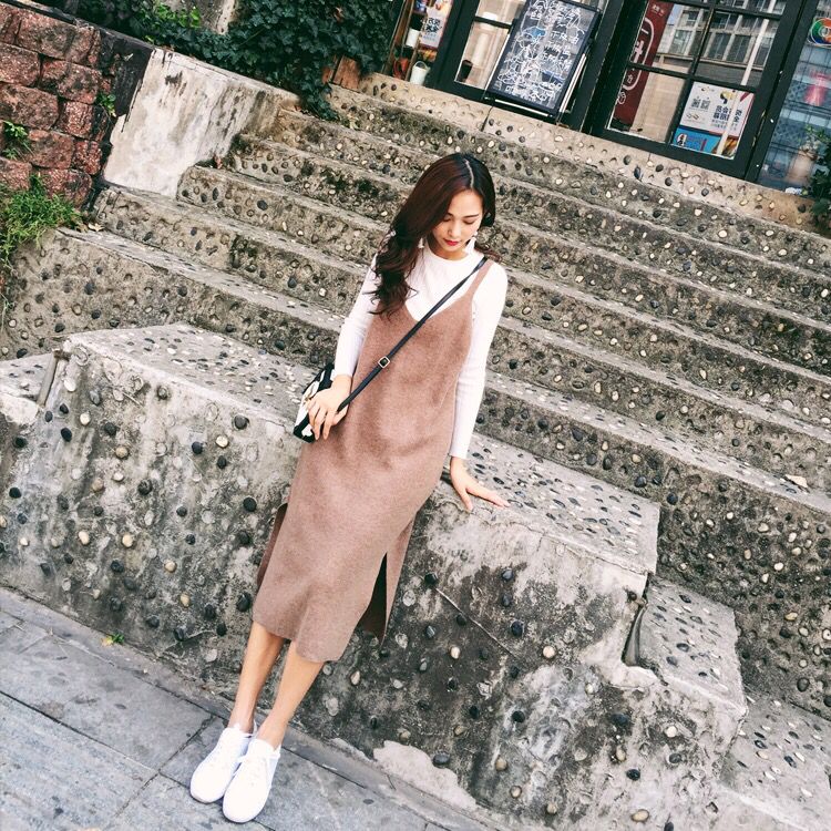 这一套针织背带裙真的很文艺,棉柔的毛线,带质感的颜色,非常耐看而且百搭穿不腻,白T做任何打底都是没有问题的,双色吊带毛衣选用了评价很好的兔绒毛料,侧缝下摆两边开叉,方便行动,满满的街头风,走在街上回头率绝对很高。