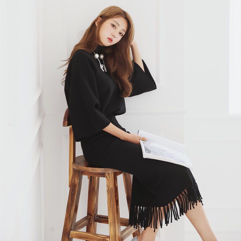 内搭也要优雅个性至极,两件套助你轻松摆脱懒癌。黑色大方低调,怎么搭配都不会出错。蝙蝠款型的上衣显瘦遮肉,包臀款针织裙展现迷人性感,流苏的设计带来灵动俏皮。这个长度也是刚刚好,今年流行这种过膝盖的长裙,但是也要看自己的身高,一定要露出一部分小腿会比较好看。