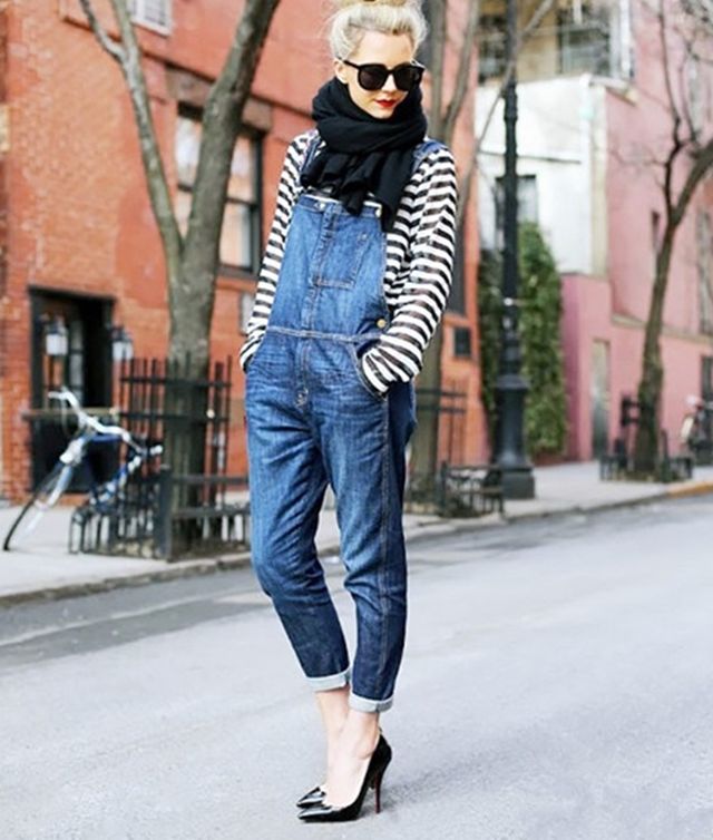 本身条纹针织衫与背带裤搭配还是很清纯大气的一种搭配呢,搭配上一双女人味十足的高跟鞋,穿衣技巧,瞬间多了一丝帅气的女人味。