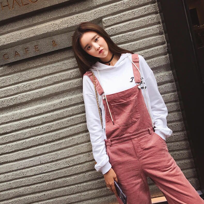 非常甜美的一款灯芯绒面料的背带裤,质地跟光泽都是非常棒的,斜纹的肌理比较显瘦,版型简单大气,上身非常的美观大方。