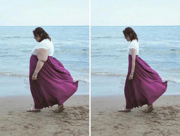 大胸妹纸一定要避免修身的上衣,相比较起来修身款,略为宽松的款式才是明智的选择。比较图中的两种穿搭,右边宽松的T恤款式是不是比左边看上去瘦了很多?
