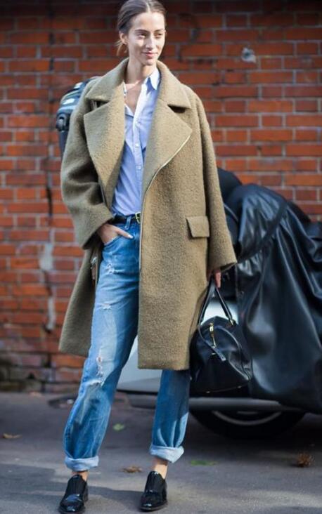 显气质的驼色,深受时尚精的追捧。冬季想要穿出率性范?选择驼色大衣+蓝色破洞牛仔裤,彰显十足个性,干练中带有一丝高贵气息,很是撩人!pick浅色衬衫,将它塞进破洞牛仔裤里,提高腰线同时更添一丝酷劲。牛仔裤裤脚的卷边设计,时髦度依旧不减,反而更添一丝减龄。脚上搭配黑色皮鞋,简约又有格调,你学会了吗?