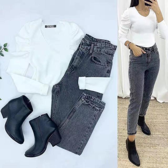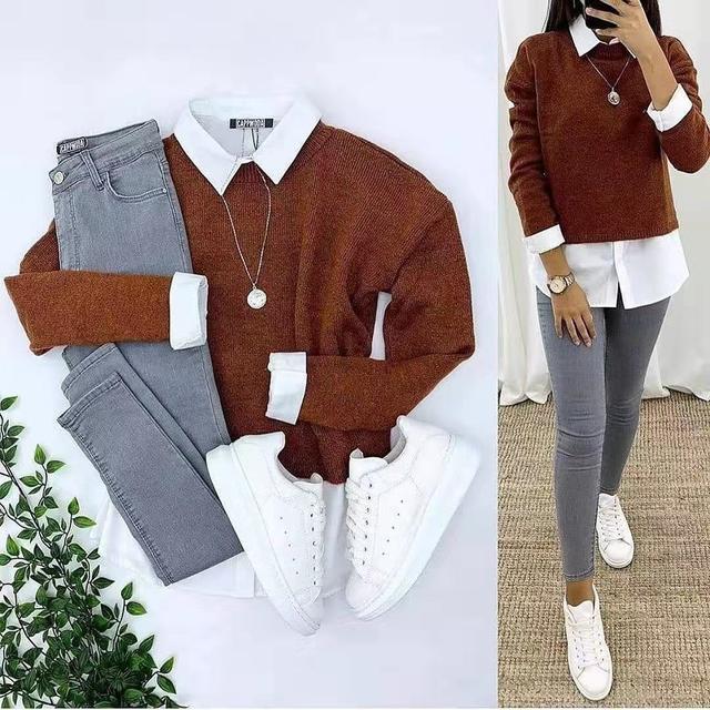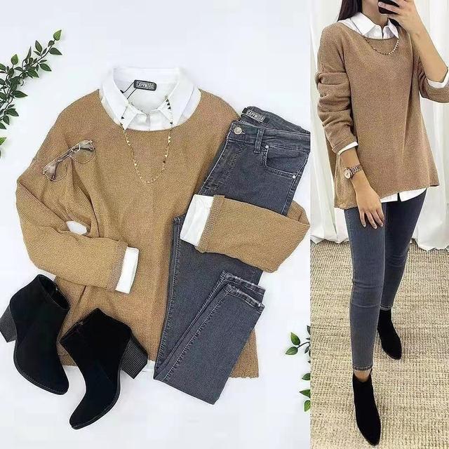 选择衬衣领设计的假两件毛衣,衬衣领外翻,侧面给人一种浓厚的职业感,非常适合一些上班族的女性。假两件的错落感,也让自身看起来具有一丝欧美范。裤子则选择灰色的修身牛仔裤,灰色作为一种中性颜色,看起来甚是简约,这样搭配起来看似简单,实则内涵丰富,给人以无尽的联想和想象。