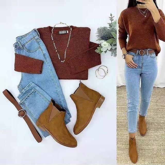 圆领的毛衣特别适合身材纤细的女人,能够很好的让人留下一种好印象,也很适合在上班的时候穿。搭配一件天蓝色的九分牛仔裤,微微露出小腿的部分和脚踝之处,毛衣和裤子搭配图片格外引人注目,也是比较时尚的穿搭方式。鞋子则选择棕色的中筒靴,不仅能与毛衣的颜色搭配起来,而且能够遮住脚踝部分,保证自身保暖问题。