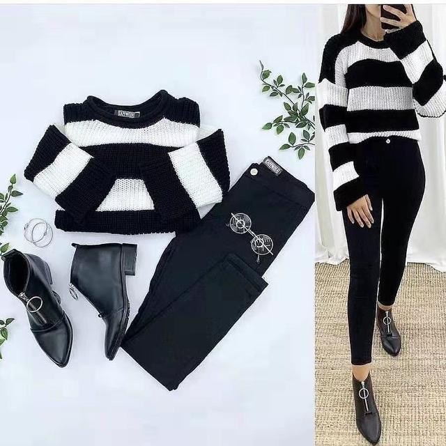 黑白色的毗邻的横条纹毛衣不失简约与大方,穿衣技巧!镂空的设计给人一种隐隐约约的性感。内搭一件简单的打底衫,就不必担心寒冷的问题了。裤子则选择黑色的修身九分裤,在宽松毛衣的衬托下,进一步修饰腿型,使双腿整体看起来纤细许多,同时也很好的构造了身材的完美比例。