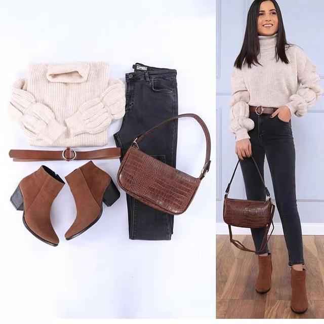 灯笼袖毛衣一款比较可爱的衣服,但这样搭配起来却是比较成熟的。高领的设计满足了保暖问题,灯笼袖的设计也让整体比较宽松,这样的一件比较时尚的毛衣,是非常受成熟女性的欢迎的。裤子选择设计比较简单的黑色修身裤,搭配一双棕色的中筒靴子,简约的穿搭穿出了浓厚的时尚感。