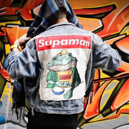 牛仔与涂鸦的经典碰撞,产出的物质就是如此的有范儿,这件涂鸦外套采用的是卡通人物的涂鸦,让你回到童年最纯真的时代,衣服的版型是比较偏向BF风的,而且还带有破洞的元素,上身绝对就是欧美街头boy的即视感。