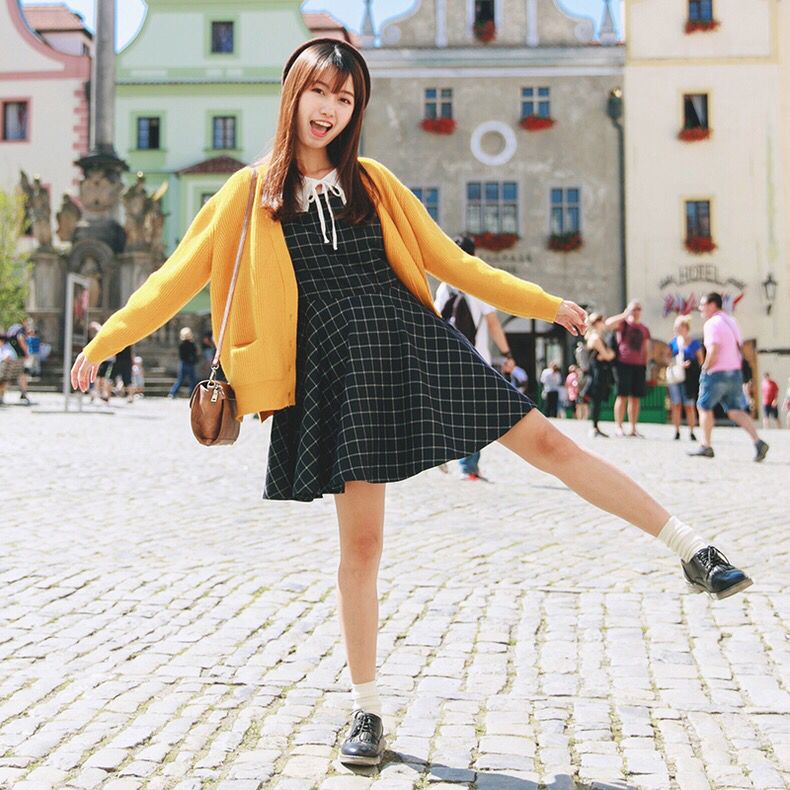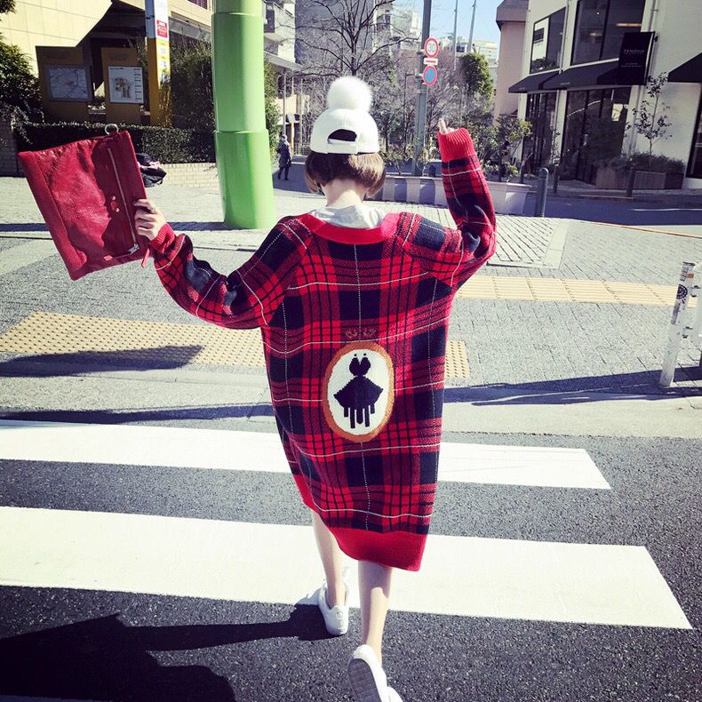 柔软的面料弹力十足,宽松的版型能够很好地遮盖身材缺陷,落肩袖的设计更加随性慵懒,红黑格子图案非常英伦风,背后的小黑裙提花图案又非常优雅。
