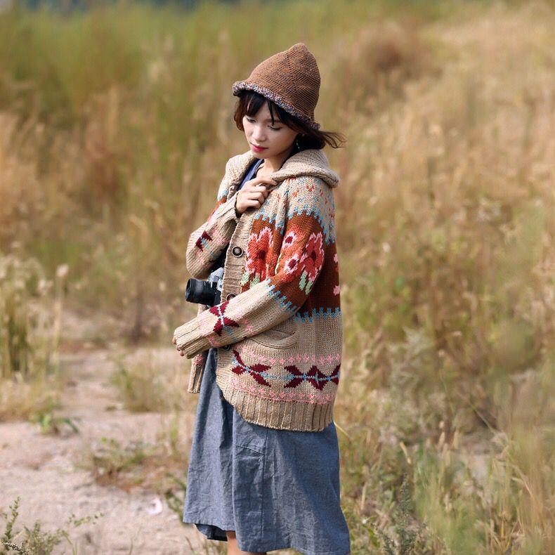加厚款的针织开衫,更加舒适保暖,粗线针织的纹理更加随性慵懒,民族风的提花图案非常复古文艺,其他服饰可以搭配素雅一点的颜色。