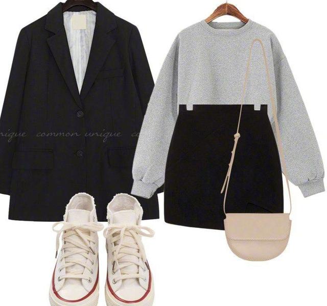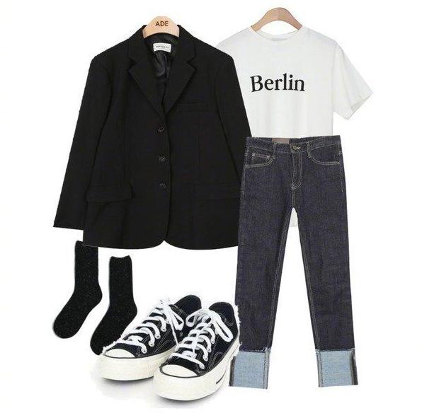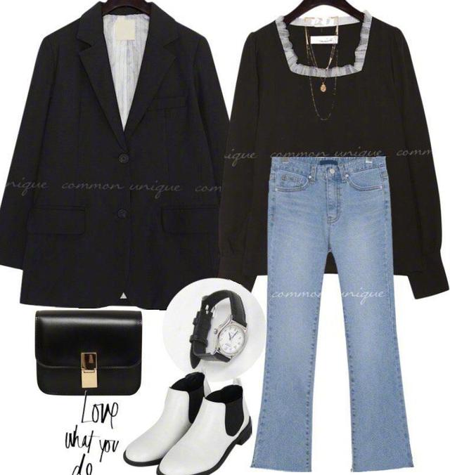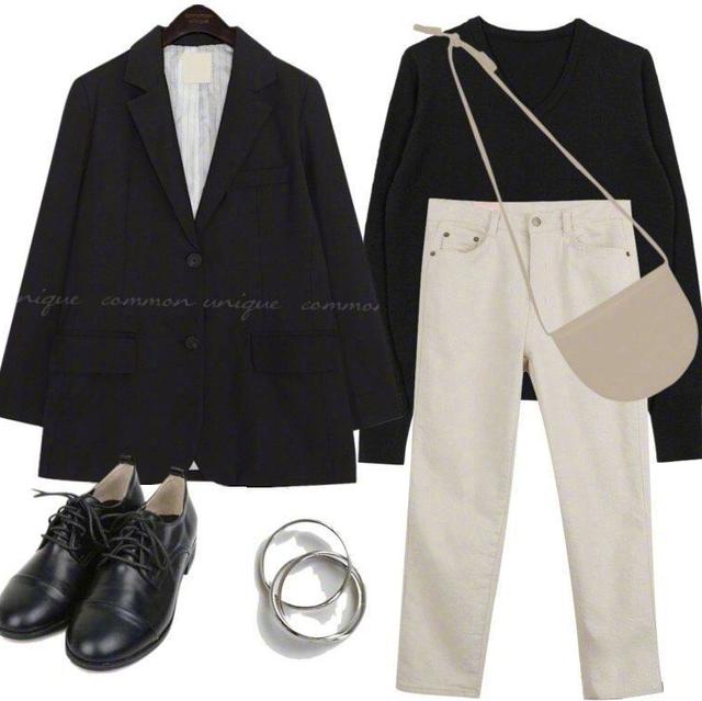要说起通勤装,这是很多女性都非常喜欢的衣服,因为在平时的生活中穿的也比较多,算得上每天必备的服装。通勤装都是那种比较简单,穿在身上也比较舒服的衣服。很多女性在搭配时,却不知道要怎样来更好地搭配这种服装。这一套通勤装,不仅在气质方面特别好,最重要的是,这套通勤装,让人看着很舒服,穿着也很舒服。黑白搭配是最简单,同样也最显气质的搭配。黑色的小西装,里面穿一件白色衬衣,下半身最好搭配,就是这条休闲牛仔裤。同时脚上的穿着一双帆布鞋,看似很简单的,一身搭配却难过,让你在这个早春成为最亮眼的那个女孩子。