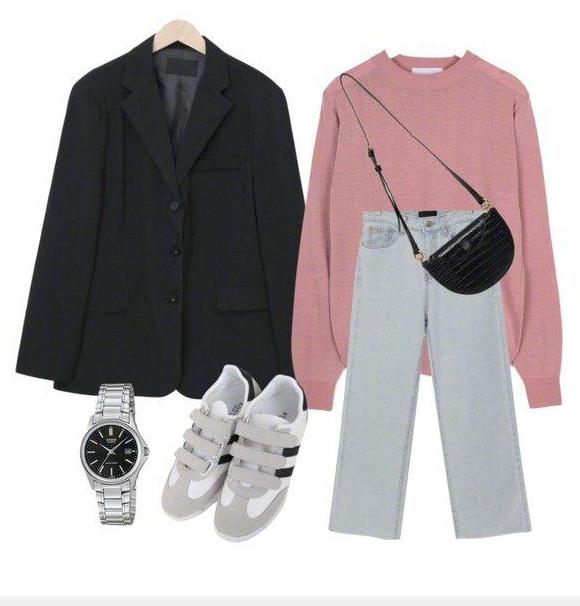 西装外套一般都是黑色的,而黑色又能够更好的搭配其他颜色,所以黑色西装外套来搭配粉红色的圆领毛衣,其视觉感也非常好,尤其是在搭配一条休闲牛仔裤,整体看上去就更迷人了。