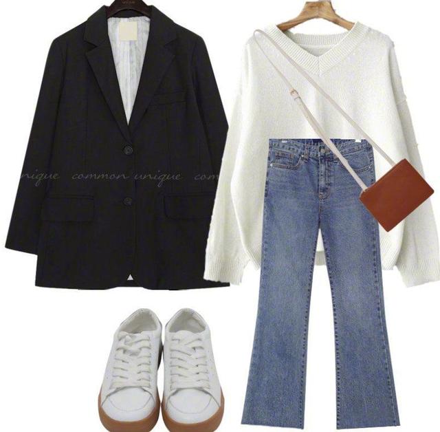 其实用黑色西装外套来搭配一件白色的v领毛衣,效果也很好,简直就是早春通勤穿搭的必备服装,同时休闲牛仔裤也是必不可少的,在彰显女性身材的同时,也能够让人看得更有魅力。