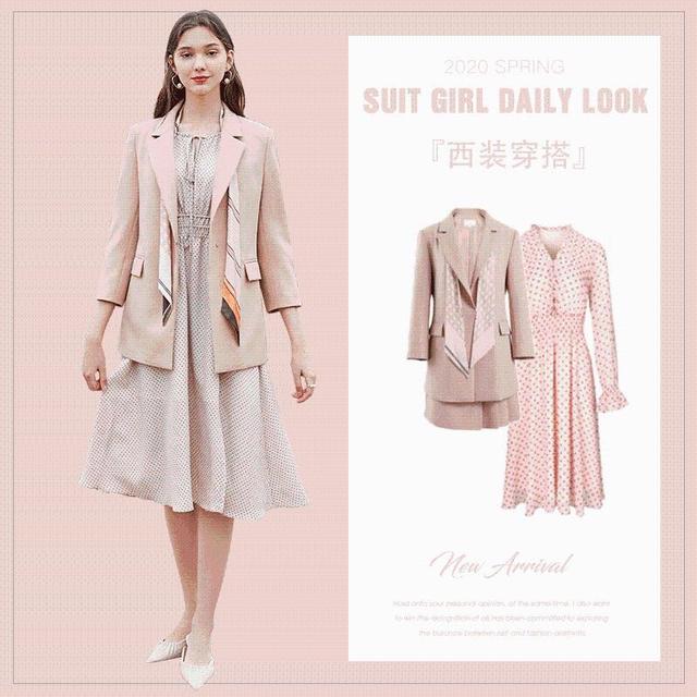 粉红色西装外套搭配粉色系的连衣裙也是一种很不错的选择,粉粉的连衣裙有波点的设计作为点缀,为整个连衣裙添了一份不一样的靓丽。不仅能够表达出来女人的柔美和甜蜜,而且对于风格的表达也非常清晰,同时这也是比较适合轻熟女在职场上或者通勤时的搭配。
