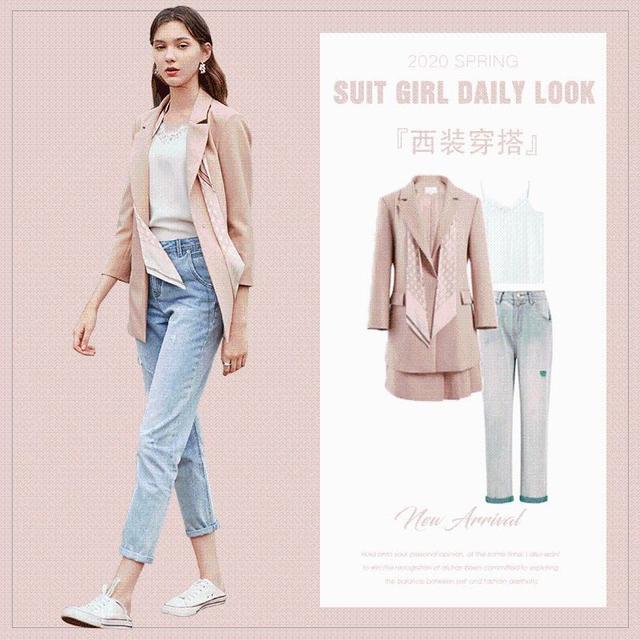 裤子搭配一条蓝色的牛仔裤,是非常有情调的穿搭,也给人一种浪漫的少女感,除此之外,粉蓝色的搭配在春天也是常见的,是为大众所接受所认可的色彩搭配,看上去显出温柔感。