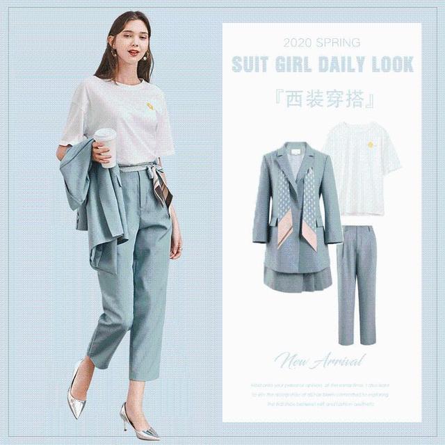 同样是蓝色的小西装外套搭配起直筒裤起来却是别有洞天的,九分的长度使得身材接近完美比例。而且小腿部分格外的纤细,从而整体的突出女生的苗条身材,露出的脚踝部分也是恰到好处,看起来很是性感。这套西装搭配更多的场合是运用在职场上,小西装怎么搭配图片女干练中不缺优雅,优雅中不失迷人。