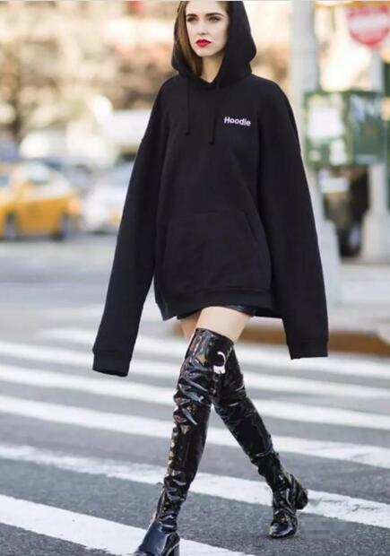如果大家的身材不错,腿又长又细,完全可以穿一双过膝长靴来搭配卫衣。当然如果个子矮小、腿比较粗的女人,就不太建议如此穿搭了。大家在用过膝长靴搭配卫衣穿时,一定要注意卫衣的款式不能太小了,大一号的卫衣宽宽松松的穿在身上,最为合适。