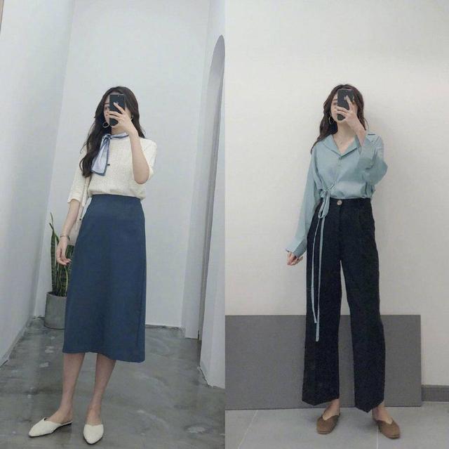今年流行的蓝色,也是融进了各大类型的服饰里,但莫兰迪色系里的雾蓝色、蓝绿色,相比纯色调蓝色,会更显高级感。建议在款式上,可以从简出发,高腰雾蓝色A字包臀中长裙,随意搭配一件白衬衣,或是加一条白蓝色丝巾,尽显轻奢熟女风,出游通勤皆可。如果觉得大片蓝色系Hold不住,可以选择上衣带灰绿色调蓝色的真丝衬衫,也能尽显30+女性的知性美。