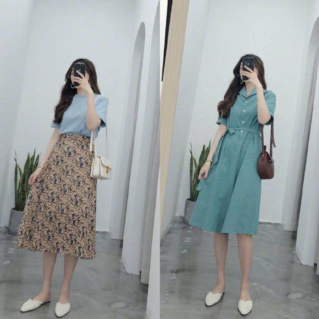 还有一些更高级的配色,譬如香槟色半身中长裙,加上深蔚蓝的图案元素,建议尽量多选高腰齐小腿长度,会更显女人的曲线美,如果还想更有质感,在面料的选择上可选真丝绸缎,既高级又奢华。还可选哑光钴绿松石色衬衣裙,冷色调的松石色,温柔又优雅,黄白黑皮穿了都显白,建议款式选五分袖,遮肉,选能系腰带款,尽显小蛮腰。