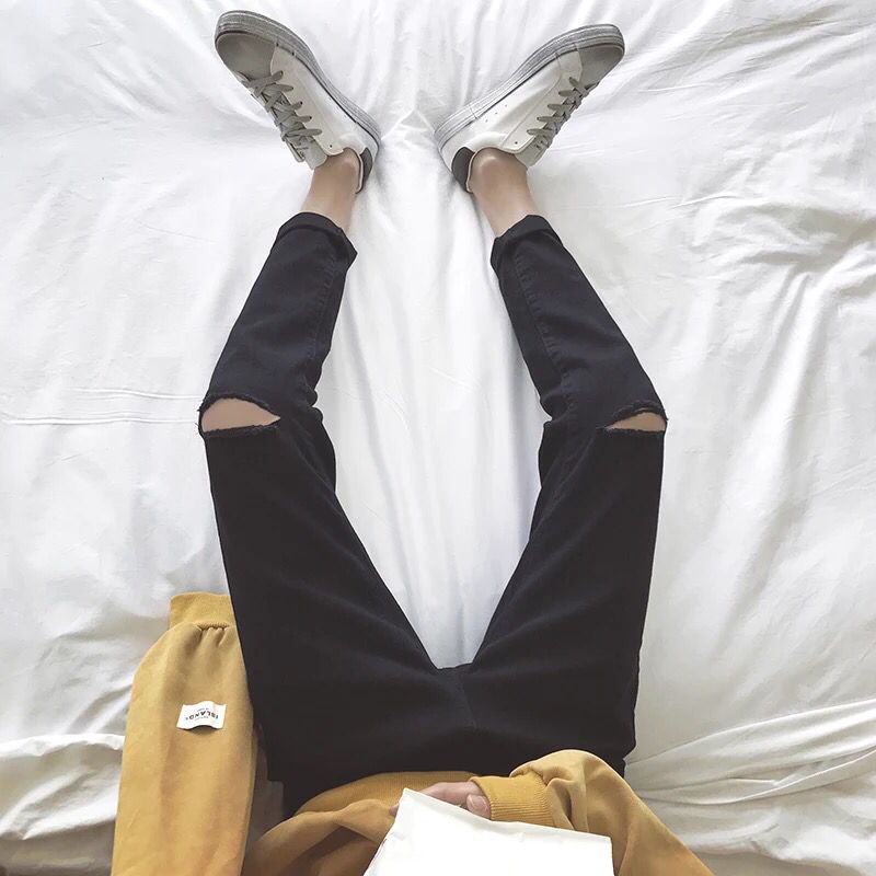 双破洞的设计,露出膝盖,九分的裤型,露出脚踝,非常的显瘦。酷酷的纯黑设计,恰到好处的增加这条裤子的潮味哦,非常的有个性哦。