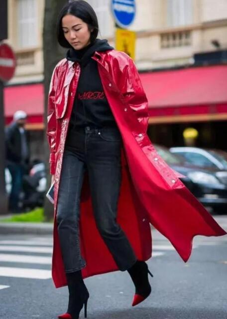 如果小仙女觉得长款外套太厚重,选择黑色短款牛仔外套搭卫衣,也是很好看的。当牛仔外套的黑色遇见卫衣的红色,产生强烈的视觉冲击力,格外吸睛,活泼帅气又减龄。下装get黑色的九分牛仔裤配上马丁靴,帅气十足。