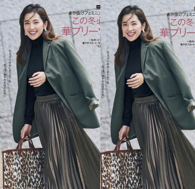 百褶裙气质更加甜美,春天里摆动的裙摆随风摇曳,更显得风韵多姿。尤其是百褶裙的设计格外的精致显瘦,竖行的褶皱特别的灵动优雅,视觉上还能压缩视线比例,看上去更加精致高级。像中村安一样,内搭一件纯色打底,气质简约又非常时尚。如果想要更加精致有气场的话,可以披一件西装外套,简约干练又高级。