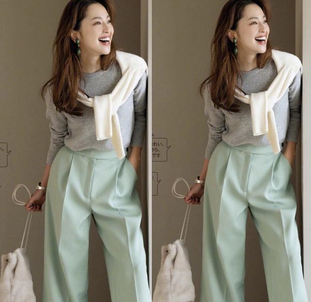 相对于优雅甜美裙子,更多职场女生偏爱裤子。裤子穿起来更加简约干练有气质,日系穿搭风偏向甜美温柔风,所以在裤子的色彩上偏爱浅色的温柔系,必须这件浅绿色的裤子,就非常的清新雅致,随便搭配一件灰色打底衫,气质简约又高级。如果用米白色针织衫来叠穿,时尚服装!效果更加时尚甜美,也是非常减龄的。