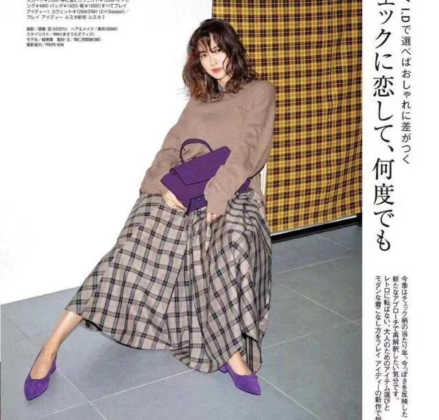 选择一件浅棕色的上衣能够展示出女人的温柔和知性,我们可以挑选一条格子长裙进行搭配。这一套穿搭会让你看起来有满满的文艺风,变成一个文艺女青年。搭配一双亮紫色的尖头鞋,看起来更具个性,我们还可以搭配一个紫色的包包与鞋子的色彩相互呼应,让穿搭看上去更协调。