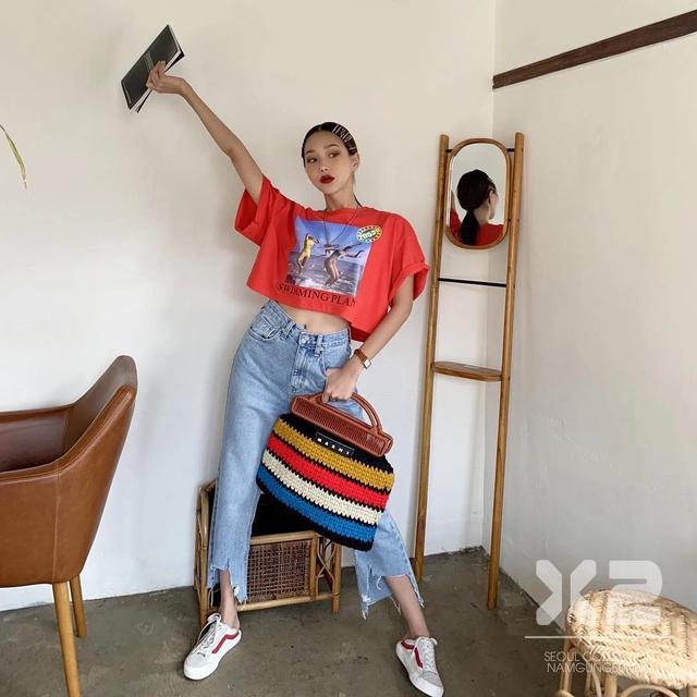 红色短上衣+牛仔裤,尽显你的青春活力,让人眼前一亮,T恤上面的人物图案,更能提升了整体的层次感,亮眼又醒目,元气满分。