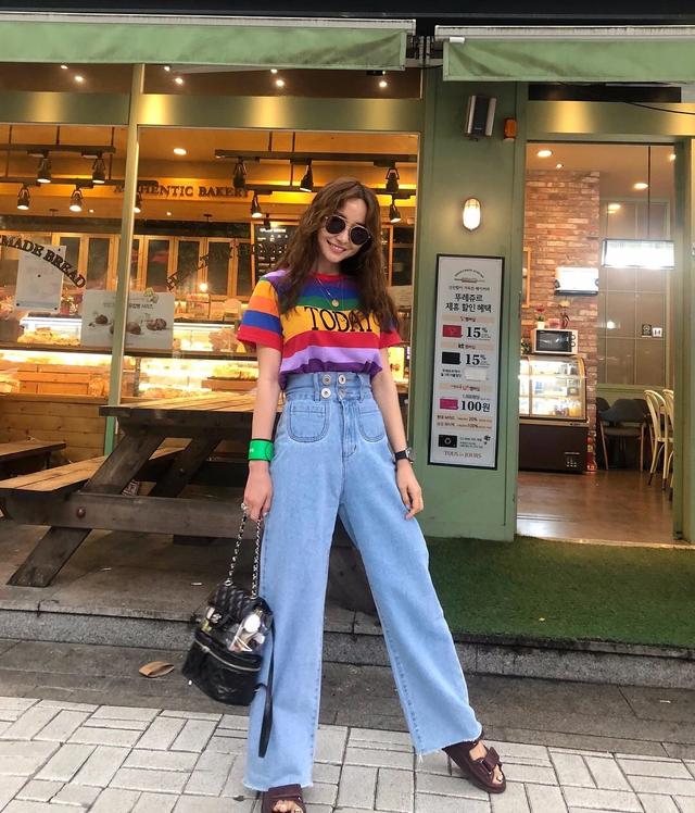 在具有活力的春夏季里,也可以让自己玩转渲染色哦,就像这位小姐姐的穿搭,混搭牛仔阔腿裤,一看就知道你的品味不俗气。短上衣+高腰裤正好就能够营造出一种你很高的视觉效果。